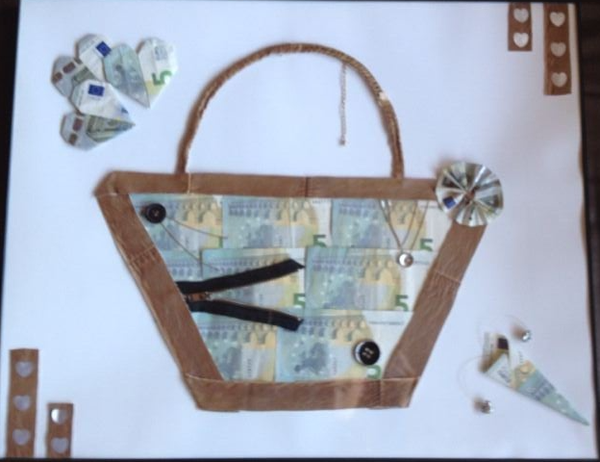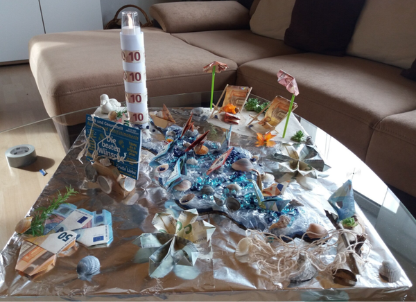 Anmerkung: Bei dem angegebenen Preis von 10 € handelt es sich nur um das Grundgerüst des Geschenks. Die Geldsumme, die schlussendlich verbastelt werden soll, wird individuell in Absprache mit dem Käufer festgelegt und muss entsprechend zusätzlich bezahlt werden.